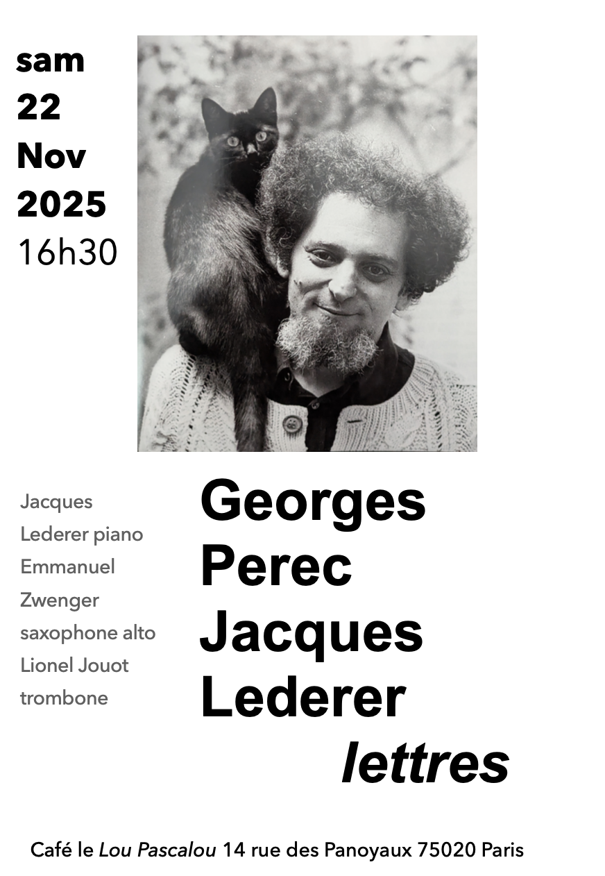Le café Le Lou Pascalou accueillera le samedi 22 novembre prochain une lecture à deux voix de la correspondance échangée à la fin des années 1950 par Georges Perec, écrivain en herbe qui effectue alors son service militaire chez les parachutistes à Pau, et son complice Jacques Lederer, sous les drapeaux à Paris. Un programme drôlement littéraire et musical avec le trio The Wanderers réunissant Jacques Lederer (piano), Emmanuel Zwenger (saxophone alto) et Lionel Jouot (trombone).